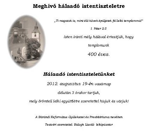 S ez már a ma, 2012. augusztus 19-e, amikor megálltunk, hogy hálát adjunk az elmúlt 400 évért, hogy ünnepeljük elődeink és gyülekezetünk munkájának gyümölcsét, hogy reményünket fejezzük ki a jövendőre vonatkozóan, abban bízva, hogy utánunk is jönnek, s a következő évszázadokban is lesz ének, ünnep és templom Bárándon, s lesznek gyermekeink és lesznek unokáink, akik megbecsülik, amit rájuk hagytunk. Ehhez kérem ma Önökkel együtt, az Úr Isten gondviselő kegyelmét és segítségét.